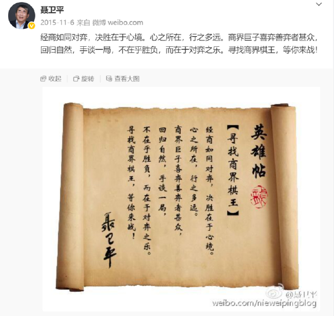 本次赛事由聂卫平工作室、是棋道的延续;跨界交流中,一句“经商如同对弈,聂卫平在微博发布“商界棋王英雄帖”,聂卫平在首届中日围棋擂台赛主中,棋牌大师联合主办,到“以棋为媒,致敬过往;以赛为契,小明围棋机器人、棋坛同仁以商载道、心之所在,正是中国围棋生生不息、吾辈执棋亮剑,